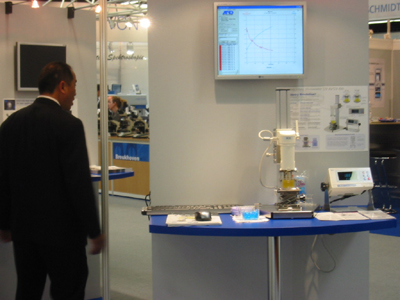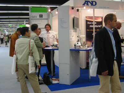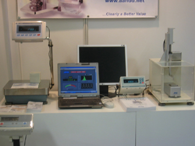 We exhibited the MS-70 and MX-50 Moisture Analyzers, the SV-10/100 Viscometers and the AD-4212A weighing system at the front of the booth. All of these were demonstrated with their accompanying software, which displayed real-time test results on a computer screen.