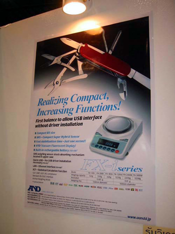 Our agent DKSH was present and had prepared a large booth, which allowed us to display a wide range of A&D balances. Our new FX-i precision balance series attracted a lot of interest and DKSH officially launched these new models onto the market at this exhibition. We prepared samples of each available FX-i model and they were the star attraction. Many visitors to our booth commented on their compact size and clear VFD display.