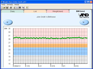 | The Weight Diary is designed to enhance usage of the UC-322, UC-321 and UC-321P Precision Personal Scales. It accepts not only your weight data to show trend and BMI, but also your daily diet and activity in order to build a record of your eating and exercise habits. This software is downloadable from A&D's website for all UC-321 users. It is a standard accessory with the UC-321P, and it transfers all data automatically to your computer if connected by the cable provided. (Data needs to be entered manually when used with UC-321.)Now latest version of 5.16 (kg version) displays a longer term trend such as 3 months in one screen. This makes recognition of your weight or BMI trend easier for watching your health. Models to be connected: UC-321P (UC-321) |