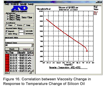 | RsVisco is software to read the measured results (CSV file) and create a graph representing the measuring viscosity in real-time as shown in the figures below. Figures 15 and 16 show the graphs representing viscosity changes of silicon oil (Newtonian fluid) measured at room temperature while leaving it cooling down from about 45°C to 25°C. In Figure 15, the graph shows the elapsed time plotted along the x-axis and the viscosity (left) and the temperature (right) plotted along the y-axis. In Figure 16, the same data is represented by plotting the temperature along the x-axis and the viscosity along the y-axis. The linearity of the correlation between the changes in viscosity in response to the changes in temperature is well presented. |
