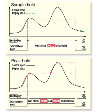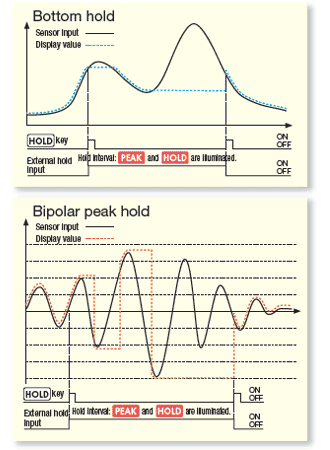 *1 Analog-to-digital conversion *2 Digital-to-analog conversion The digital span calibration function makes it possible to perform a calibration by entering the rated output (mV/V) of the sensor using the numeric keys. This function is useful when an actual load cannot be applied. The display, the comparator output and the D/A voltage output can be latched (data output hold). If bouncing of the comparator value occurs repeatedly near the upper/lower limit, a heavy burden will be placed on the relay circuit and other parts. To prevent this, the AD-4532B has a function to set the hysteresis width and time. |